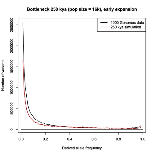 Then it wonāt fit in the 60% - 70% range. What you can do is have the ancestral population biased toward lower frequency alleles, so that more come through that bottleneck at 25% than under the constant-sized model. I ran one such scenario last week. Hereās another, which is the best I can up with; it has a rapidly expanding population prior to the bottleneck:
