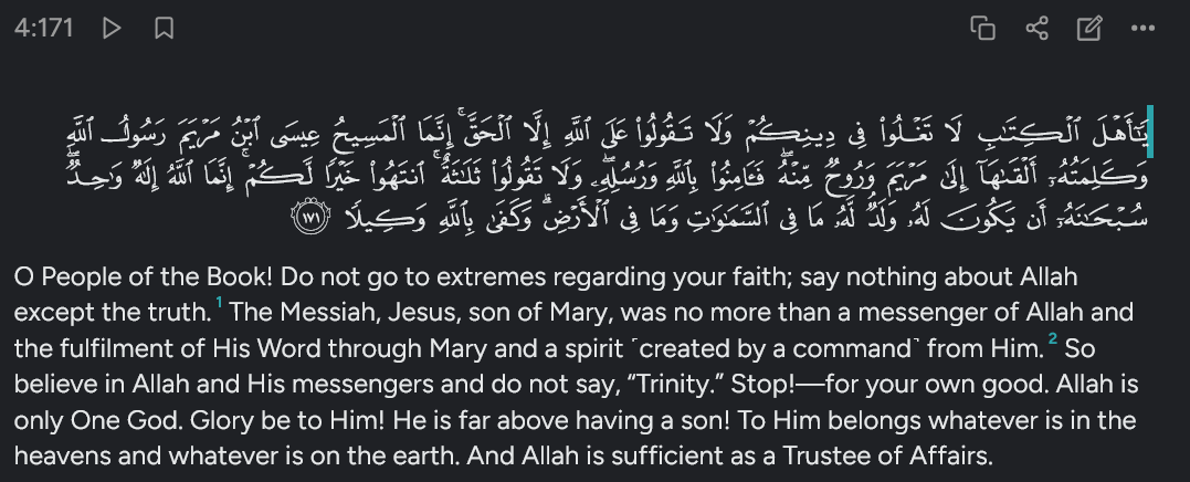 I agree Christians sometimes explain poorly, but I think it’s also important to note that many Muslims’ baseline picture of “Trinity” comes directly from the Qur’an’s own polemics (“do not say three,” “third of three,” and the Jesus/Mary passage). So even a perfectly clear Christian explanation can still collide with what their Scripture already tells them Christians believe.