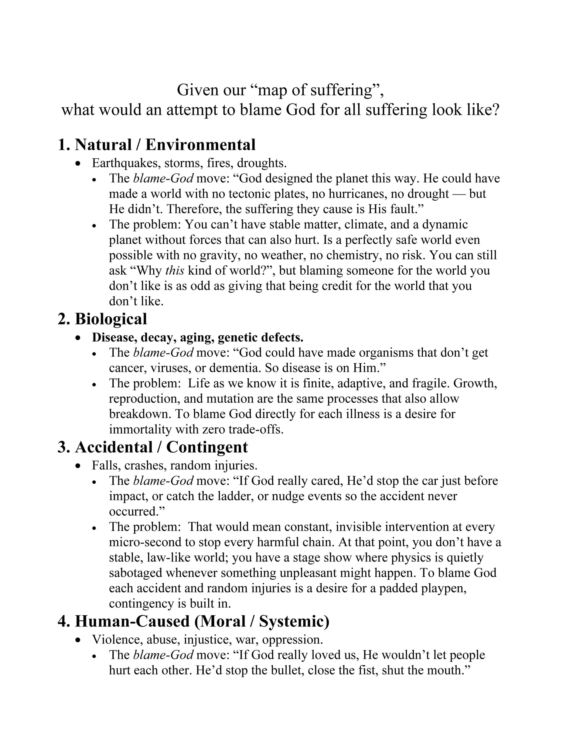 | I. Natural (Non-Moral) | Geophysical / Climatic: earthquakes, hurricanes, tsunamis — the cost of a stable, law-bound universe.Biological / Ecological: disease, parasitism, predation, genetic flaws — the price of evolutionary freedom.Cosmic: asteroid impacts, radiation — vulnerability of life in a dynamic cosmos.Entropic / Temporal: decay, mortality — the finite structure of time-bound creation. |