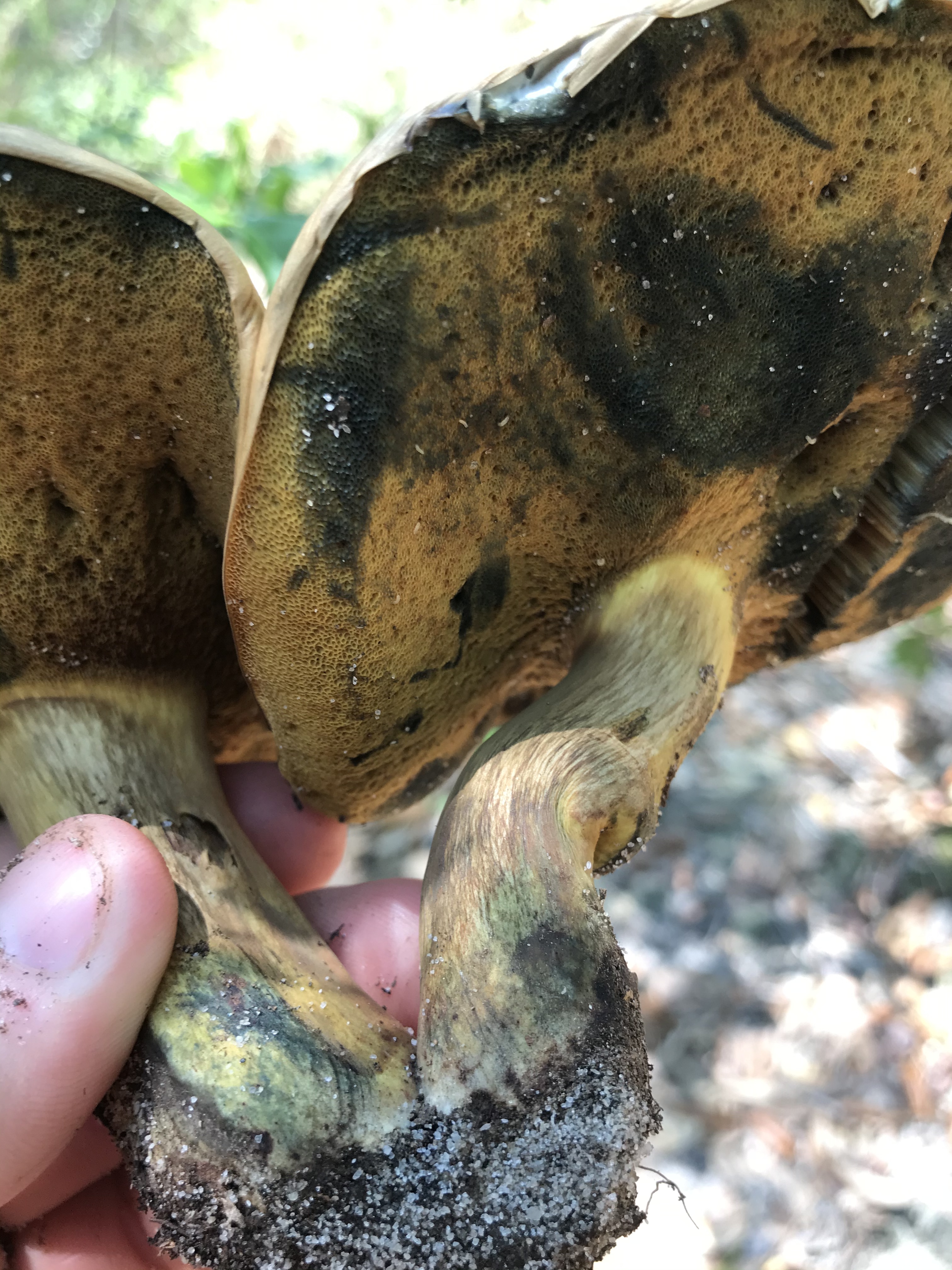 The mushroom is some species of Boletus. I’ve not IDed it yet but most likely , even if it was not maggoty, it’s inedible as seen by the blushing black tints. Really focusing on learning more spring and summer edible mushrooms this year. So far the puffballs sautéed in garic and oil is the best. Just don’t mistake them for the egg form of the fatal destroying angel and slice them in half to ensure it’s pure while and not yellow.