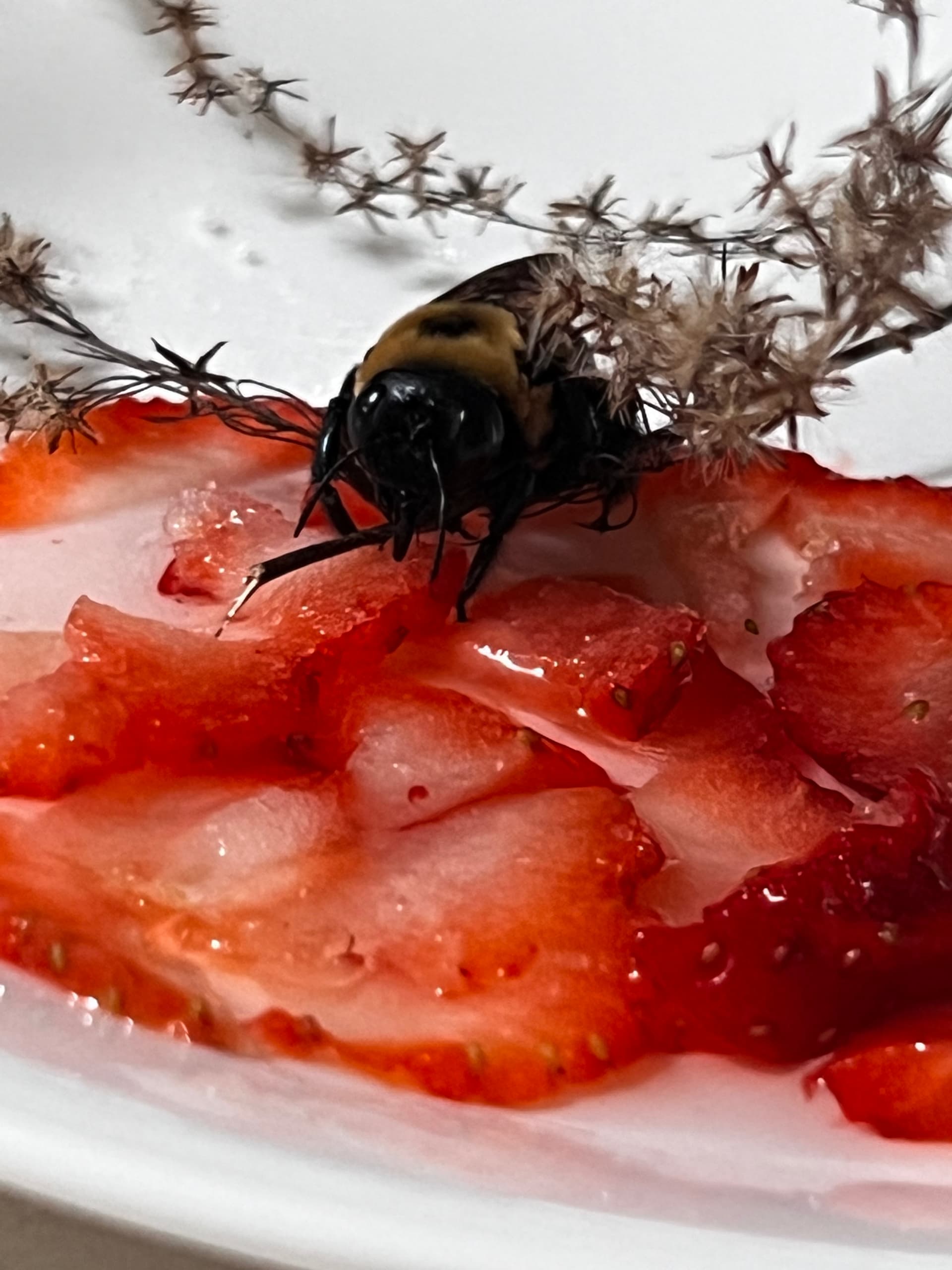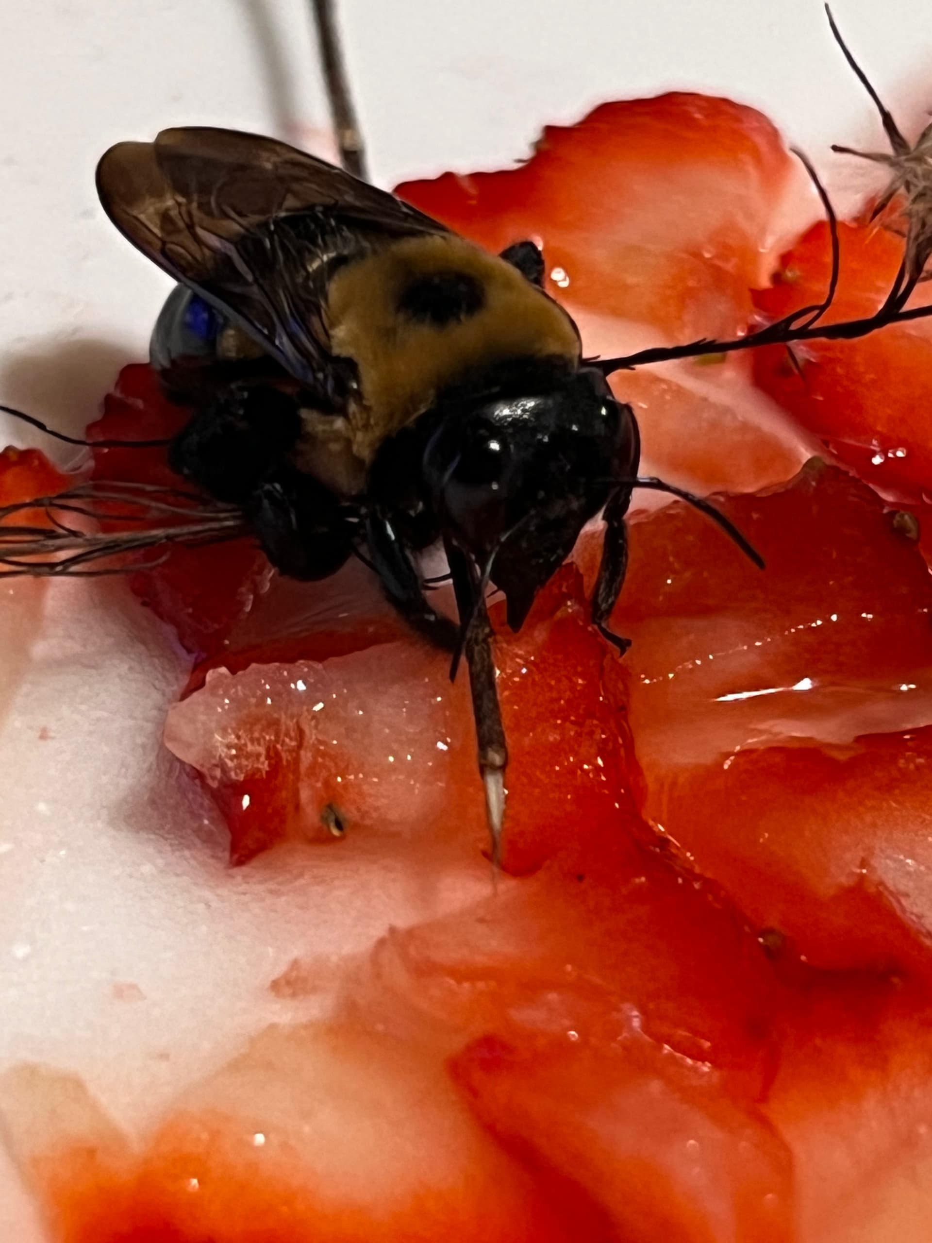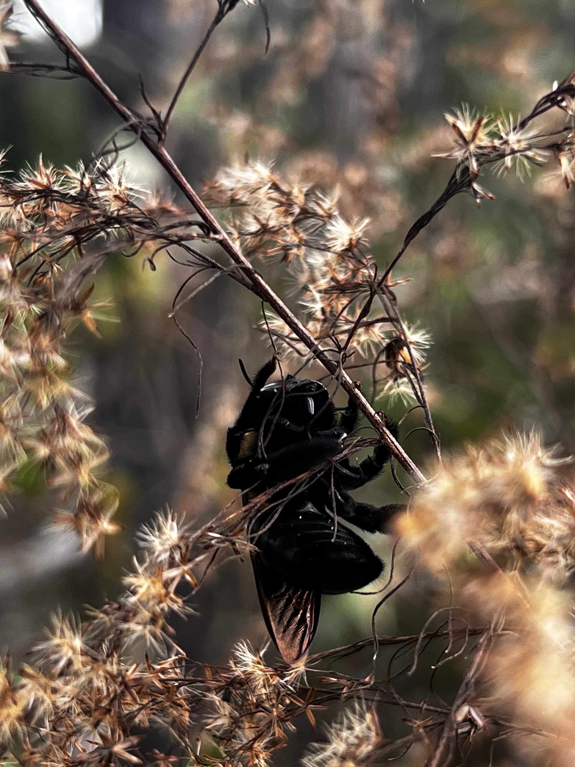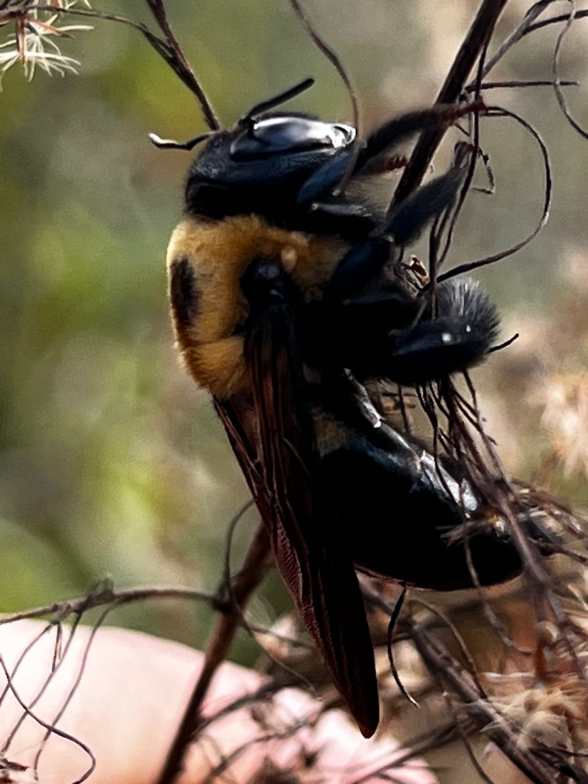 So while hiking today came across this obviously starving Carpenter Bee. Carried it around for an hour trying to find some good flowers for it. Could not find any.