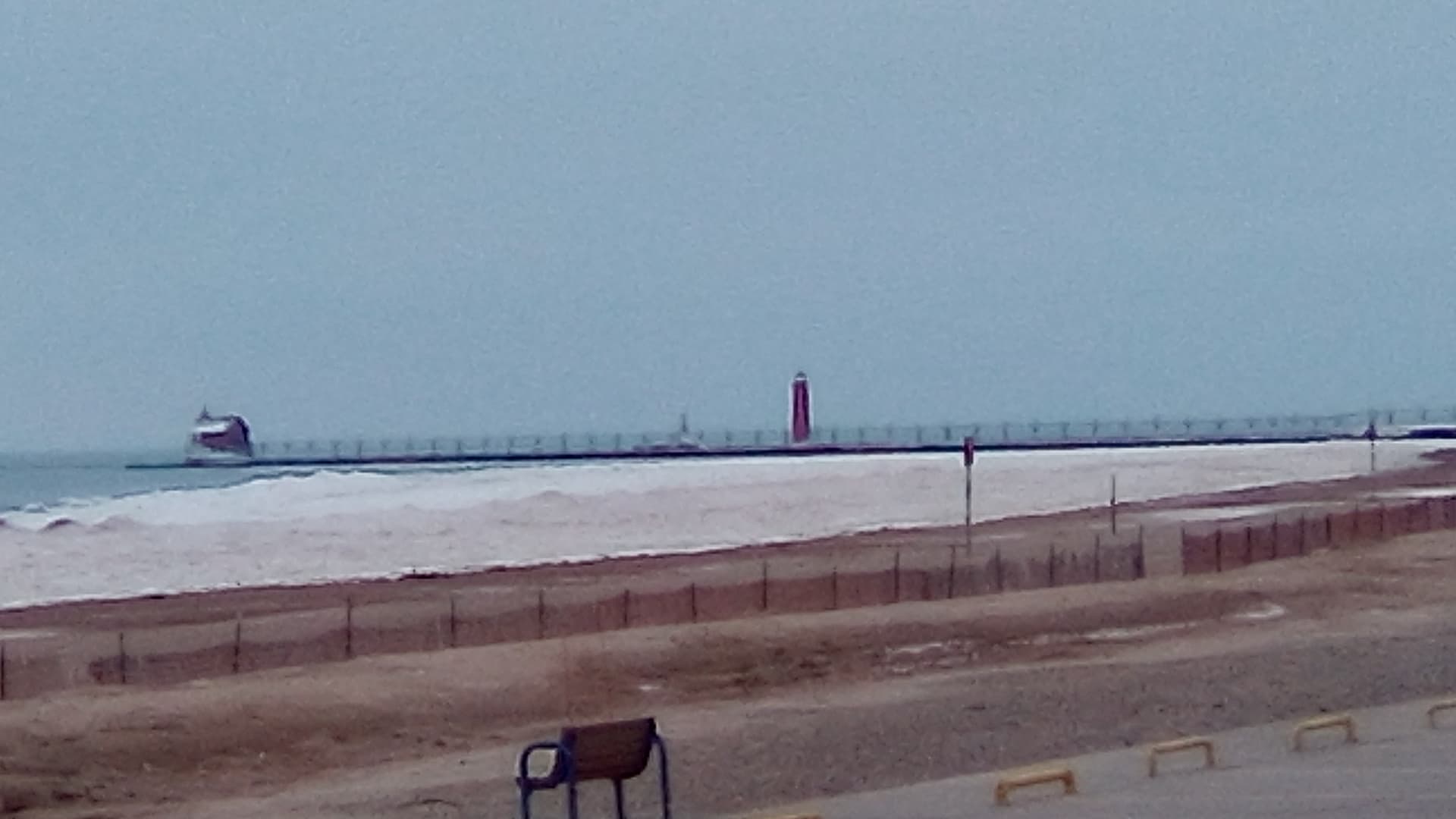 Grand Haven pier and lighthouse… there is a blanket of ice several inches thick on the pier and an ice shelf with 10 ft high mounds cast up by the waves, to my left (sadly did not catch that portion). It’s about 35 degrees today, so quite a bit warmer than before during the blizzard. Thanks