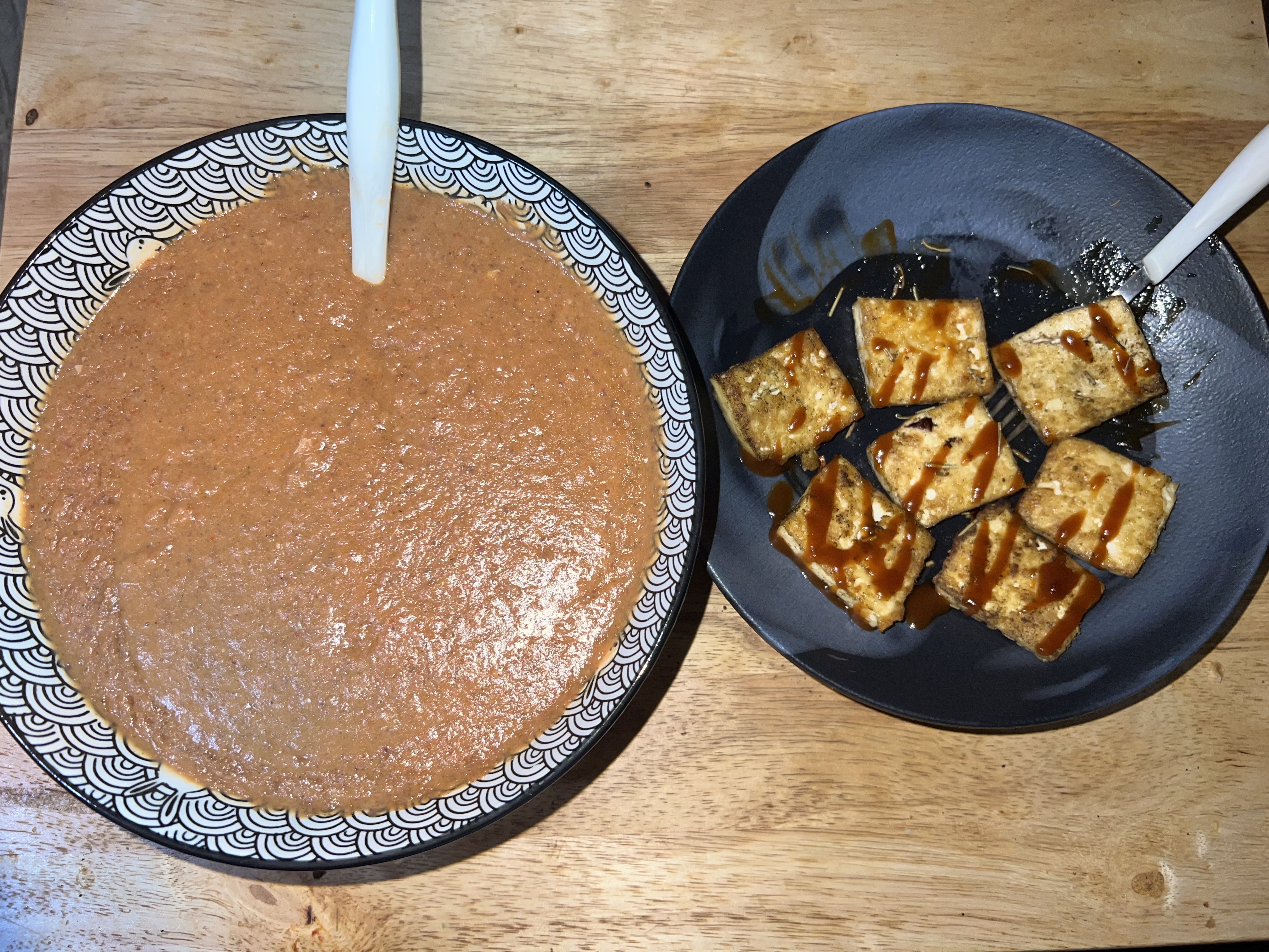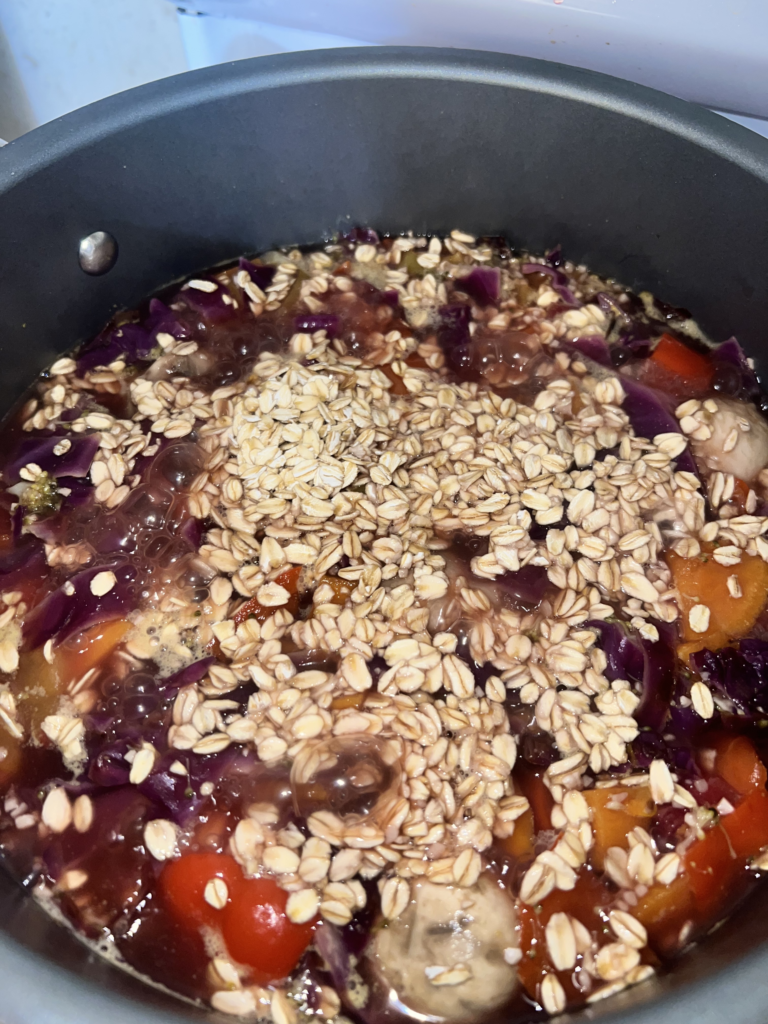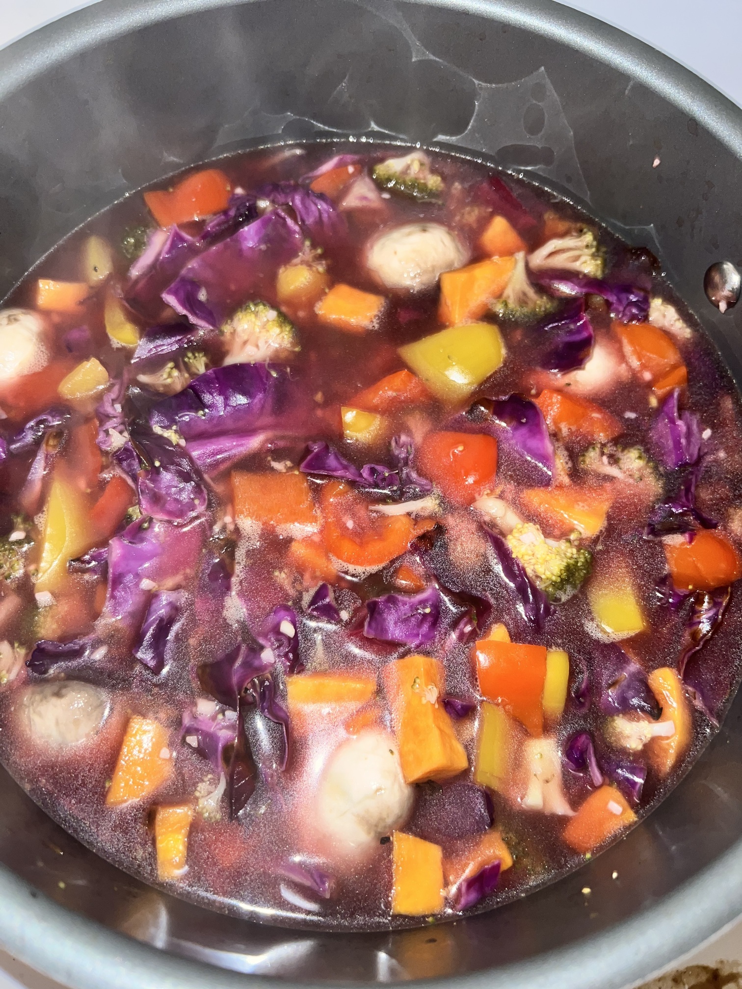 Made a nice soup earlier. Boiled sweet peppers, white mushrooms, sweet potato, red beet, garlic, broccoli, red cabbage and once soft added vegetable broth and steel cut oats to it. Finally added yellow curry paste and a can of coconut milk. Once everything was really soft placed it in a blender for a soup.