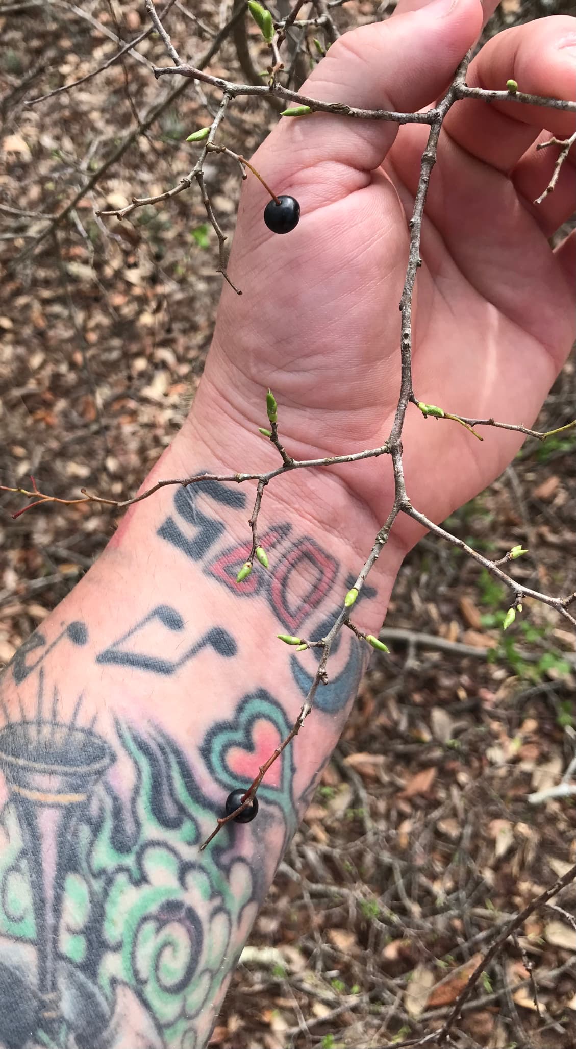 A species of very “blueberry/huckleberry. The few berries remaining were very sweet. Most likely the majority of this shrubs foliage and fruit was stripped off of it by a black bear*. There are several in the area. I’ve seen several tracks in the area and it’s know that about 6 live on the island I was hiking.