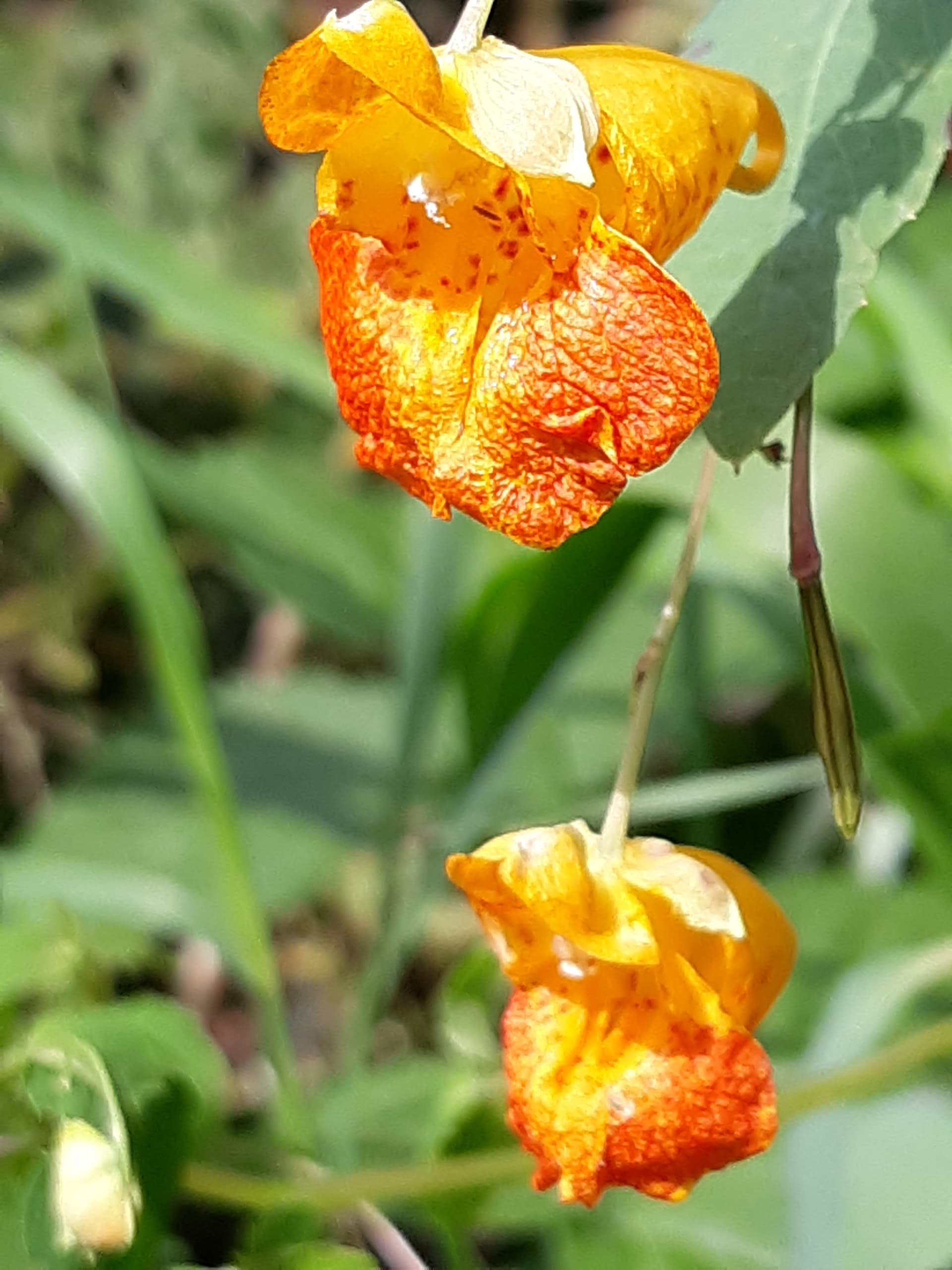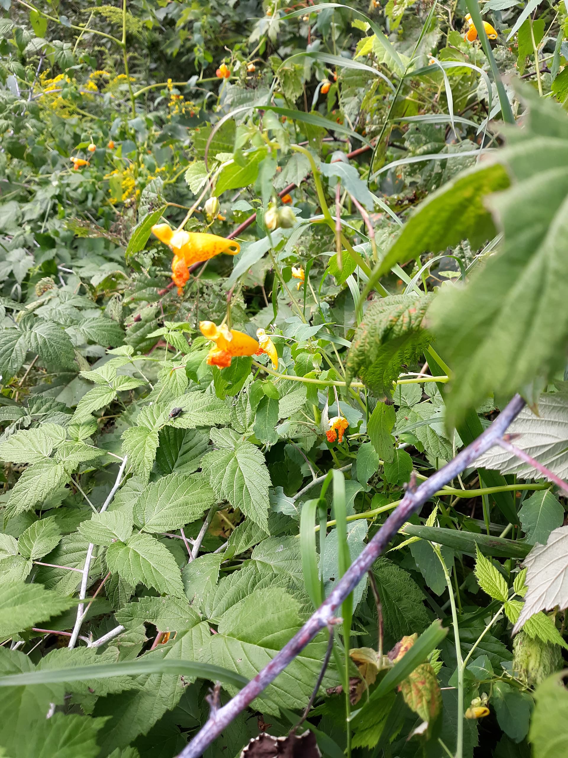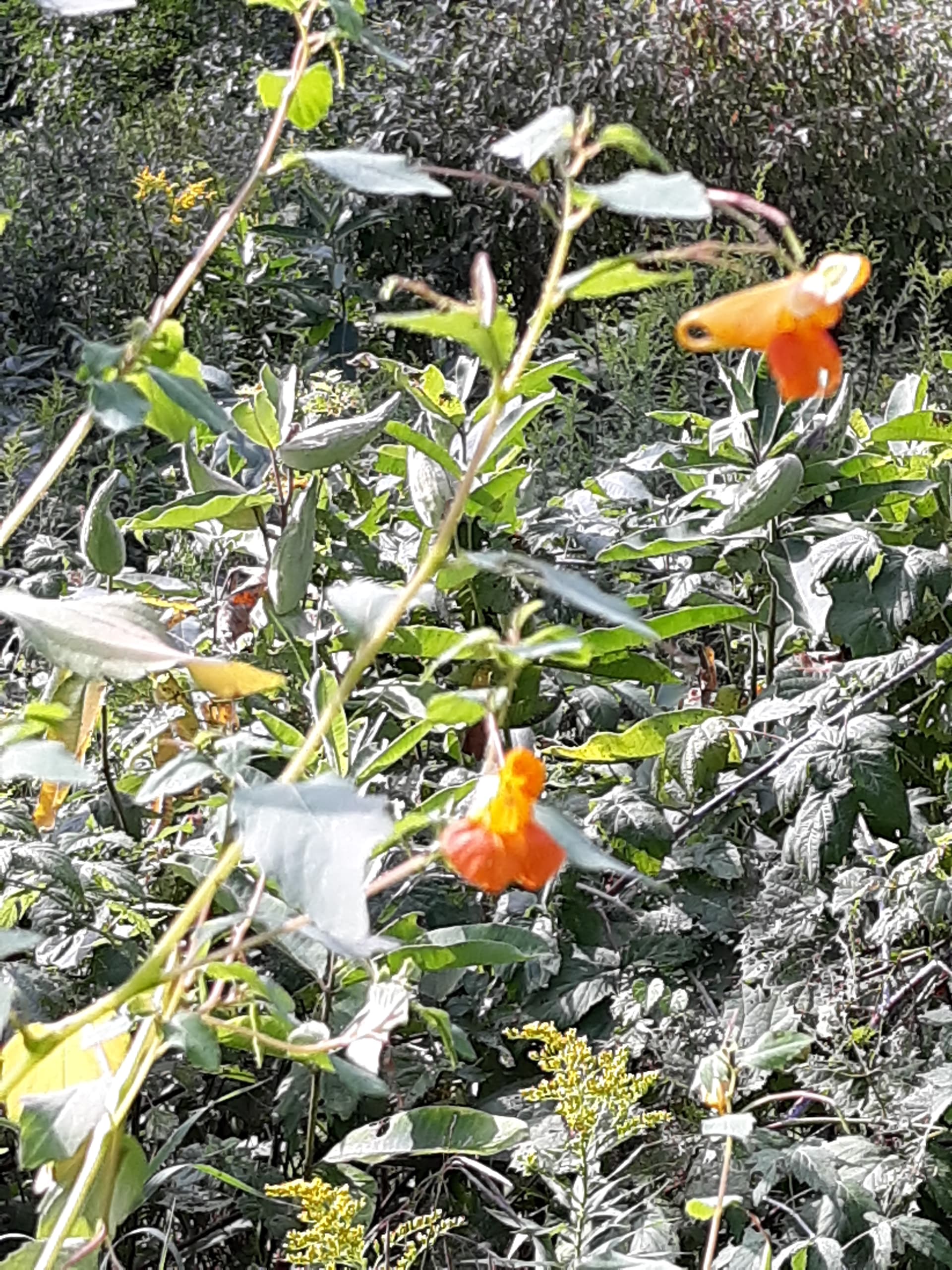 This was a lovely surprise, an enormous (compared to what I normally see) Spotted Touch-Me-Not (Impatiens capensis). They normally grow near ditches and in shade in this area. This plant must have started in the shade of some larger plants, until I got at least 5’ (152cm) high.