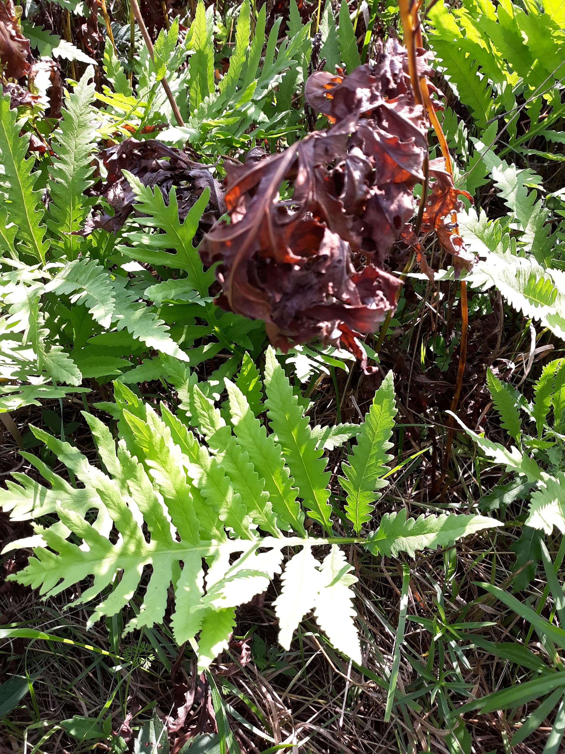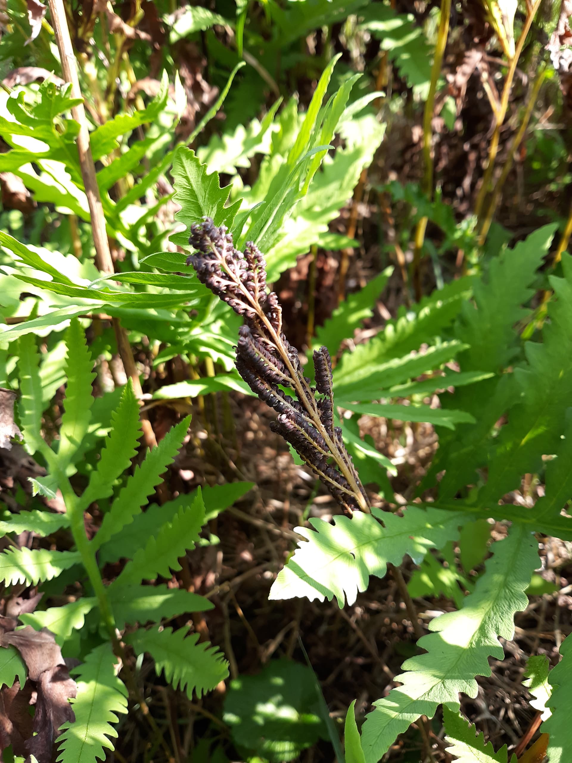 The sensitive ferns I was able to identify earlier this summer (I think this is the first plant I’ve ever identified with a key. woo hoo) have finally develped their fertile parts, and the fronds are starting to die back: