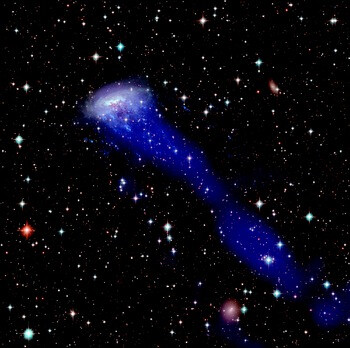 Another fun example is Galaxy ESO 137-001, which is a Galaxy being gravitationally pulled the upper left of this picture:
