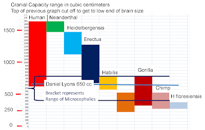 At this point I am going to ask a question, in light of Mr. Lyon’s brain, should we extend the range of normal brain size down, like in the chart below, making Mr. Lyons at the bottom end of human normal brain? After doing this, empirically, looking at this human range brains of normal intelligence we see that it covers the entire span of our evolutionary fore-fathers, with the exception of the Australipithecines.