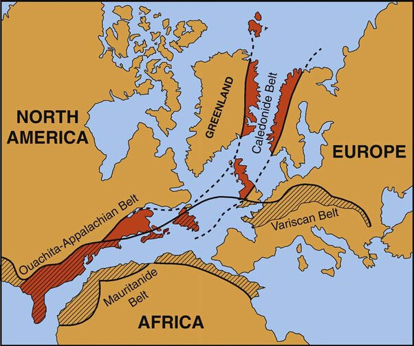 The Caledonides (Scotland to Scandinavia) mountains are a continuation of the Appalachians. The Great Glen fault (including Loch Ness) is the contact zone between the old continent pieces. Parts of Great Britain are underlain by peri-Gondwanan terranes - broken off of South America or Africa, so there’s at least three continents in the mix, not counting smaller continental blocks.