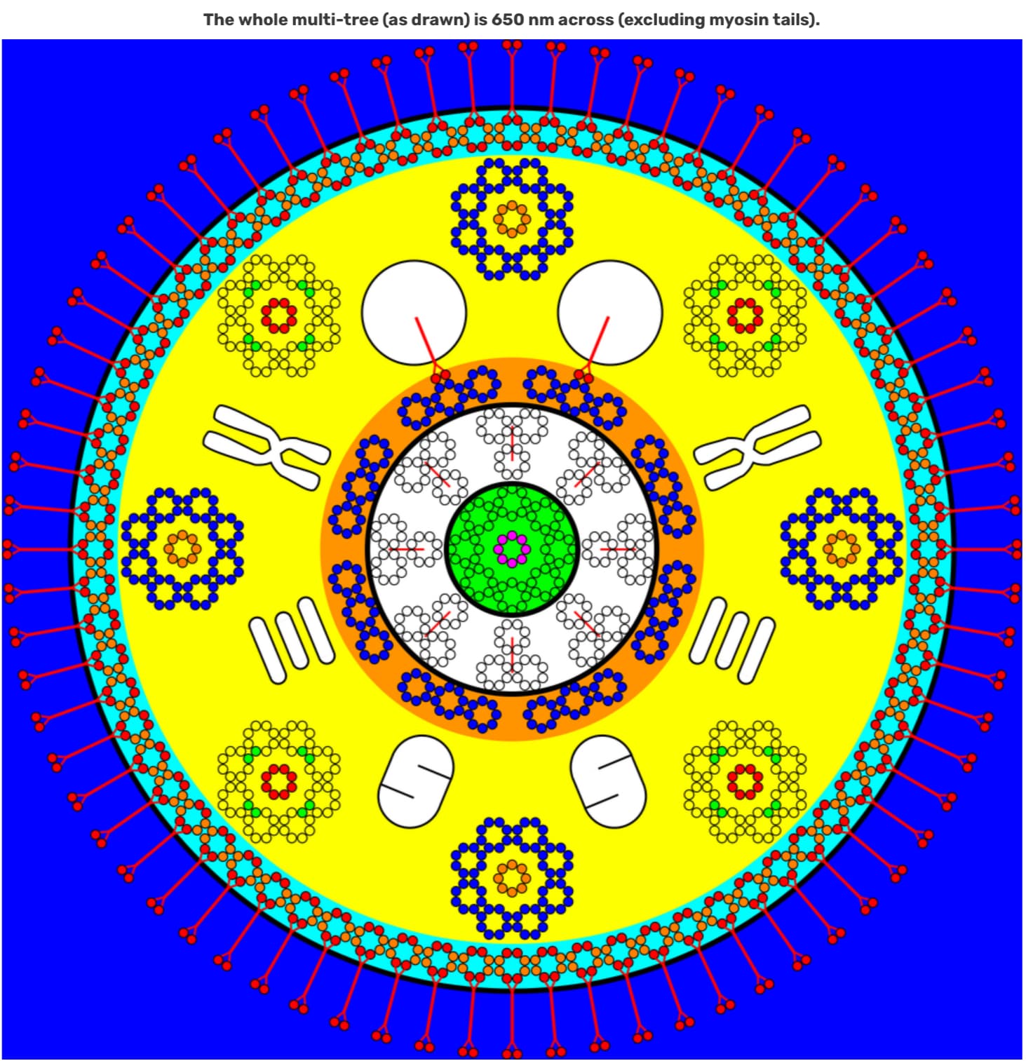 1 perfectly straight vertical 33-nm fibre chromosome (purple) in the exact center. (This is the original self-reproducing tree from which all the others are derived. The “head” tree. This stage in its lifecycle actively swam and collected PM’s when they first hit the surface of the water.)