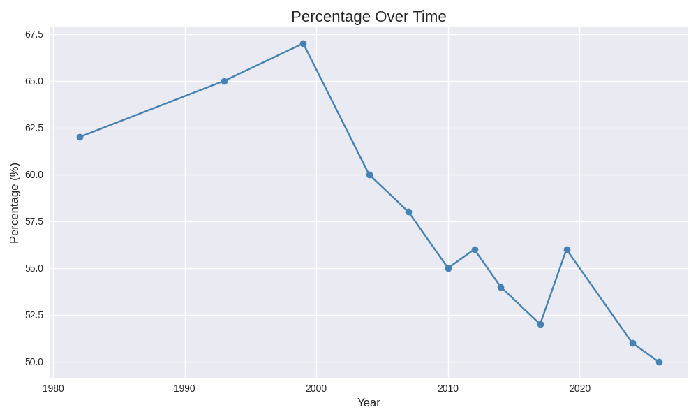 Precise year-by-year data specifically for “American Protestants” is not released annually; however, major surveys from Gallup and Pew Research provide consistent data points for this group over the last 40 years.