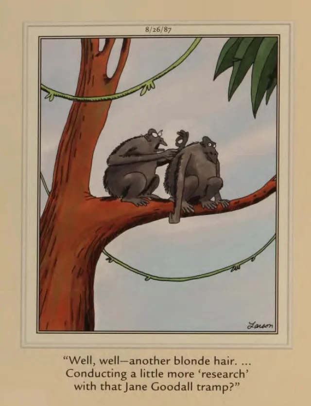 A repeat, as Beaglelady posted this in Nov. 2022, but thought it a good time to reflect. While Jane Goodall’s organization took offense, when she saw it she thought it quite funny, and later even wrote an introduction to one of Larson’s collections.