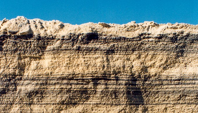 The generally sharp crisp boundary between layers suggests rapid deposition.