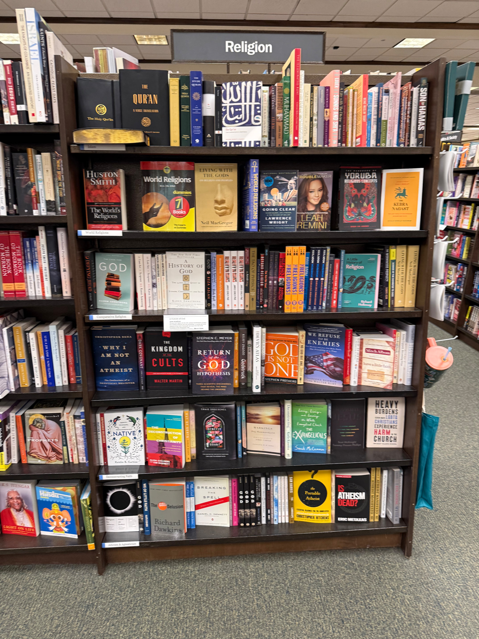 Second question comes from a glance toward the religion section of the store. Quick side note, I was a bit concerned about the amount of Satanic-adjacent literature there, including a book on the history of witchcraft and the occult (which I had originally thought was J.K. Rowling’s “A History of Magic,” based on her book series Harry Potter). Speaking of interesting book placing, right next to the science section was the ghost/conspiracy discount section on a small table, which I thought was pretty funny. Anyway, I found the section on religion and was hoping to find The Language of God, to which I was disappointed to find no luck. Alternatively, I did find a bit of an odd and surreal sight: