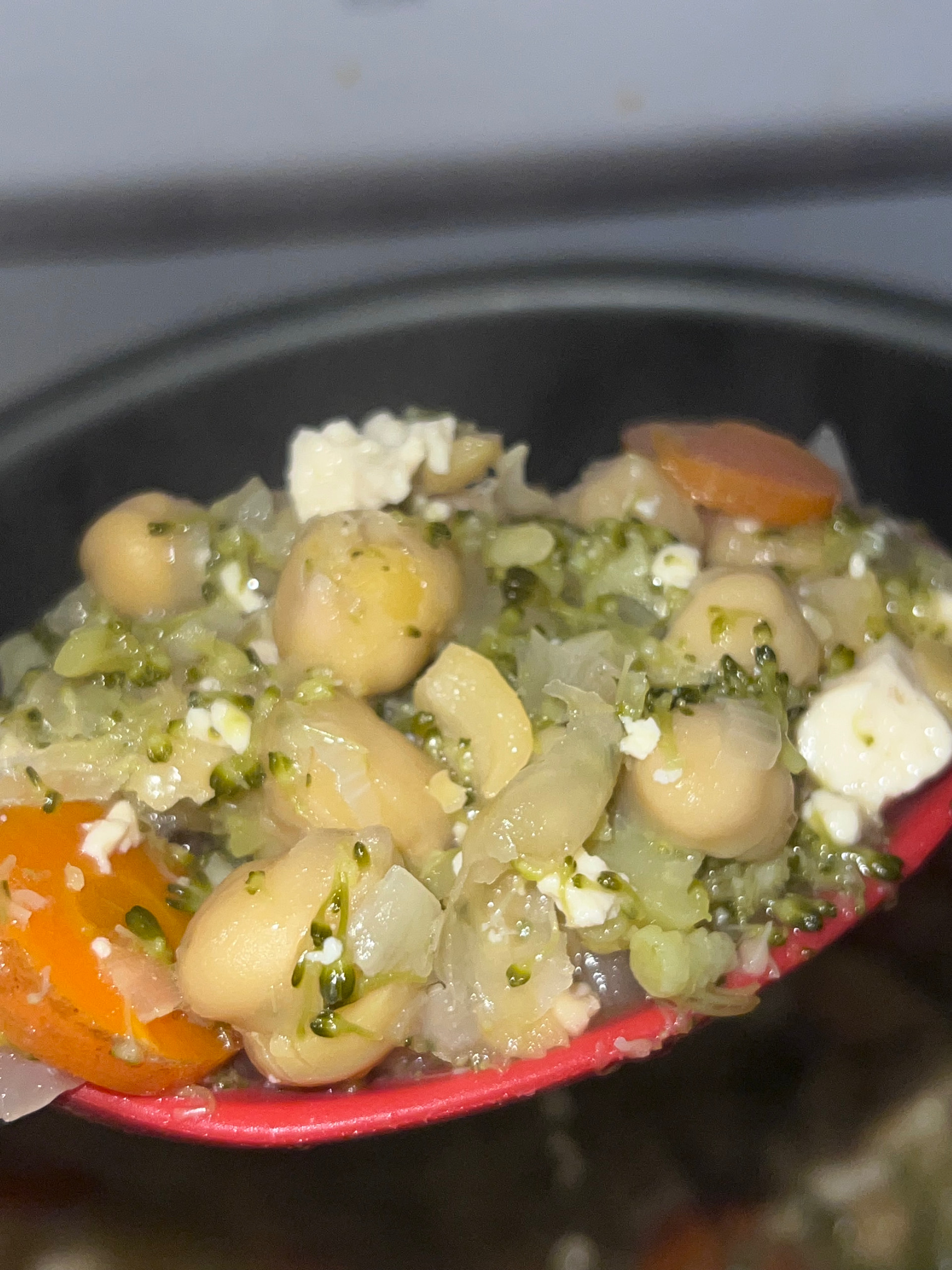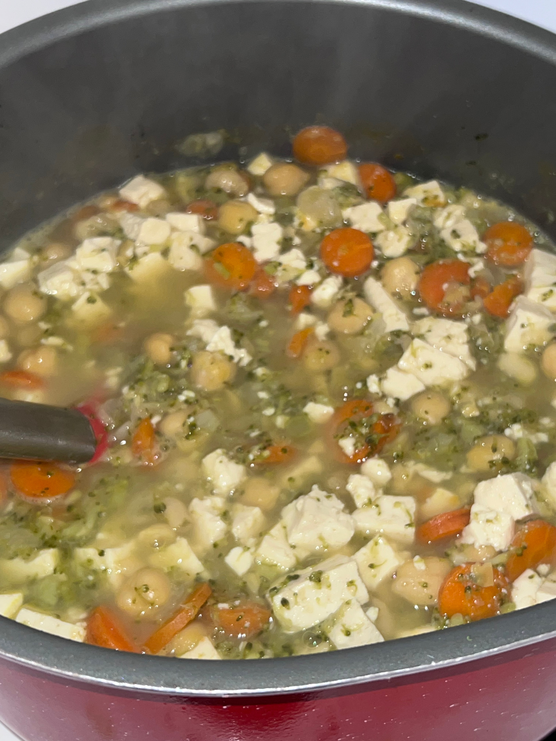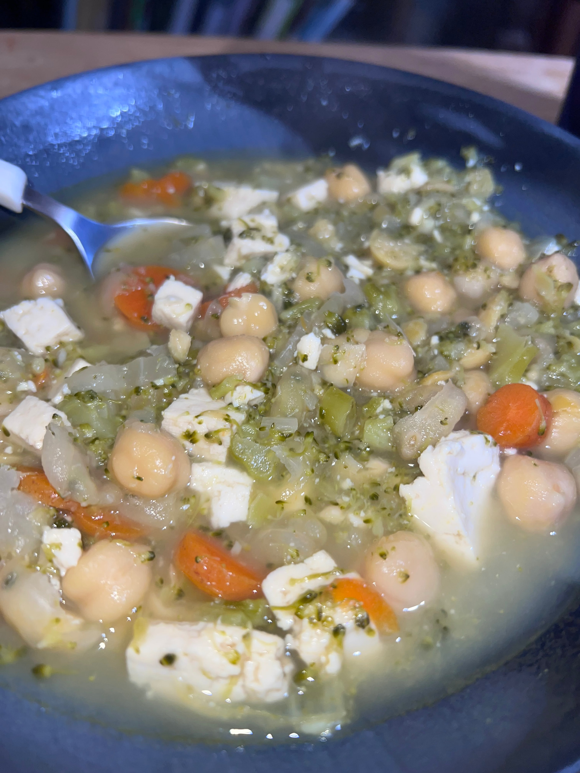 Veggie soup. “ better than bouillon “ the vegan chicken broth imitation paste. Then diced up sweet onion, carrots and broccoli with tofu and lots of chickpeas.
