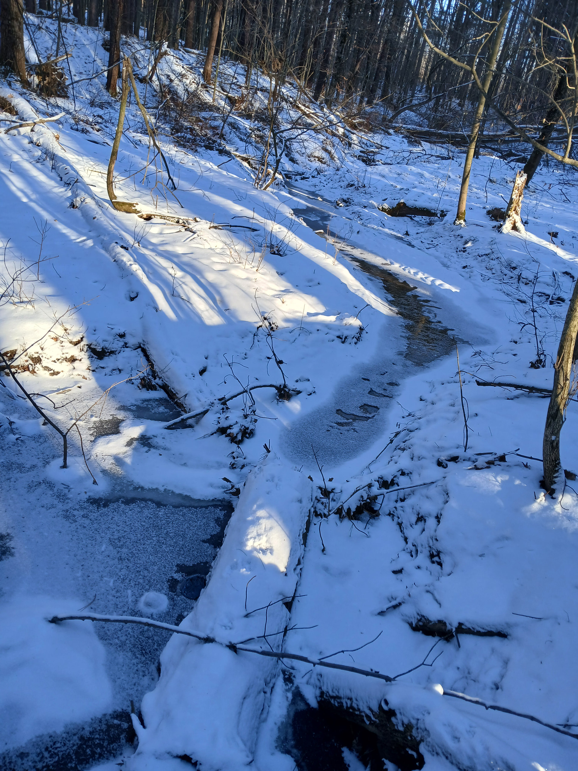 I thought the the stream was really beautiful, too. And the sound of the trickle of water.The colors are really muted, but still dramatic with the black trees and the bleached, dried grasses.