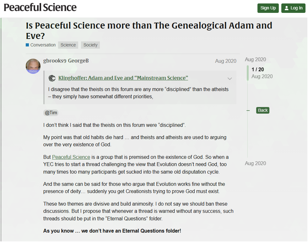 “He has so far declined all other invitations to discuss how an energetic group of non-theist Evolutionists can develop and sustain a sense of trust and “peace” with Christians Creationists… Creationists who have little choice but fixate on the atheist motivations of their correspondents (because there are so few theological discussions here embracing God’s use of evolution to create humans). Regardless of how unpersuasive my appeals have been (apparently EXTREMELY so) … the pro-Evolution Christian audience continues to vote with their feet. I can only join them.”