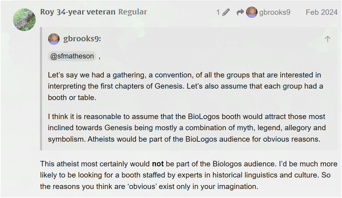 My last sentence was wrongly expressed: “Atheists would be part of the BioLogos audience…” should have been written more fulsomely as “Atheists, rejecting Adam & Eve as historically de novo creations, would be more tolerant of BioLogos for obvious reasons!”