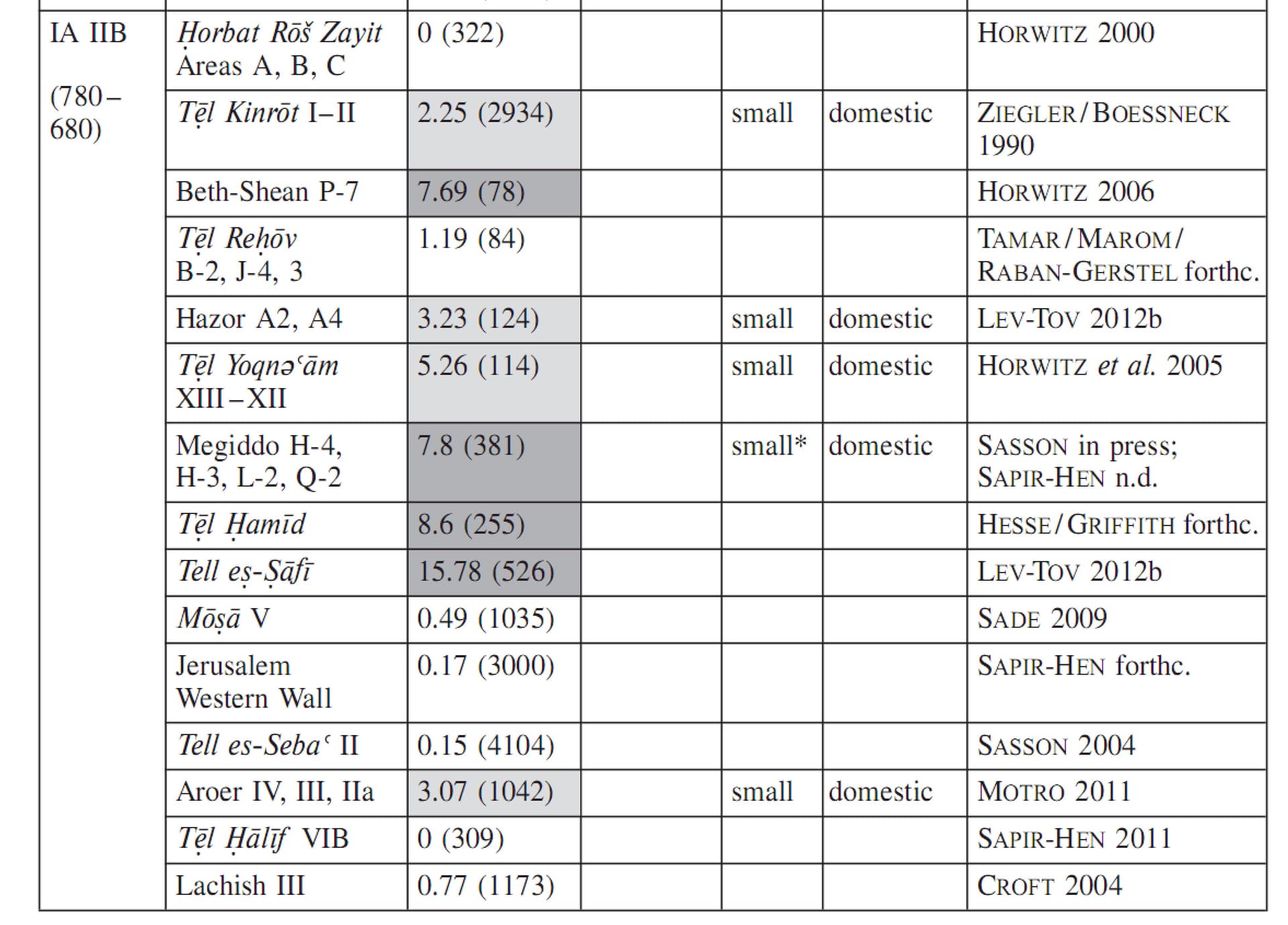 I’m finding van Wyk 2014 to be more than a little problematical. Here, they are citing commentary by Sapir-Hen et al 2013 that discusses the data in generalities, and does not clearly differentiate which of LB IIB and LB III are under discussion, rather than citing Table 1 (on page 4) which actually gives the data. This shows that they have only have Shiloh and Tell Dōthan data for LB IIB (1300-1200), and that they had no data for either for LB III.