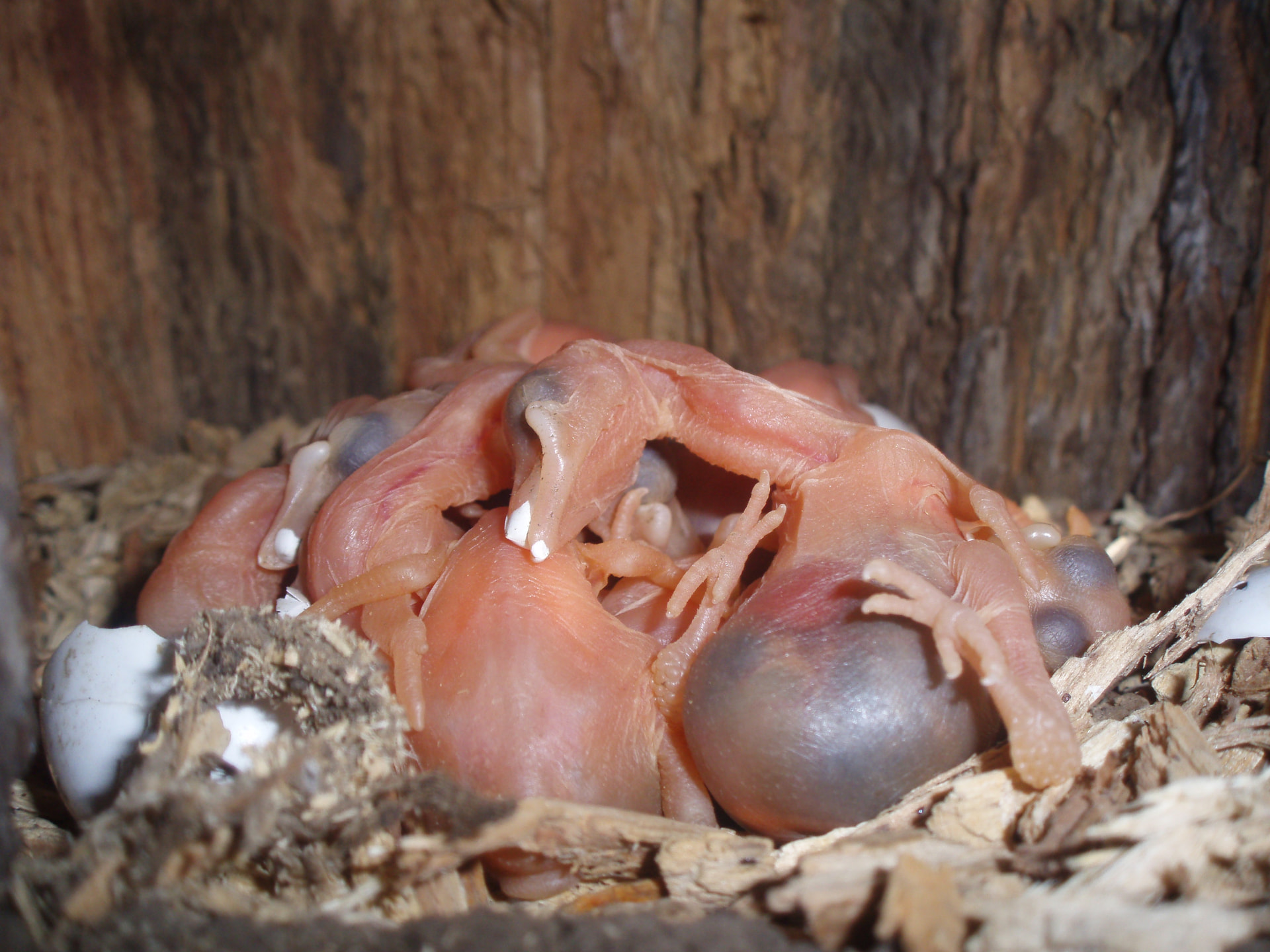 Yeah, woodpeckers are among the most “altricial” of birds, hatching at an extremely undeveloped state with no down feathers whatsoever and blind. Very odd looking. The skin is really thin (the bluish mass is the intestines seen through the one nestling’s stomach). They have very long necks and note the calcareous white “egg teeth” on both the upper and lower mandibles. Most other species have one egg tooth on the upper bill to crack through the egg shell and it is shed a couple of days after hatching. Young flickers retain both egg teeth through the whole nestling period–in a dark cavity it helps parents see where the sides of the mouth is, to help parents find the mouths to feed..