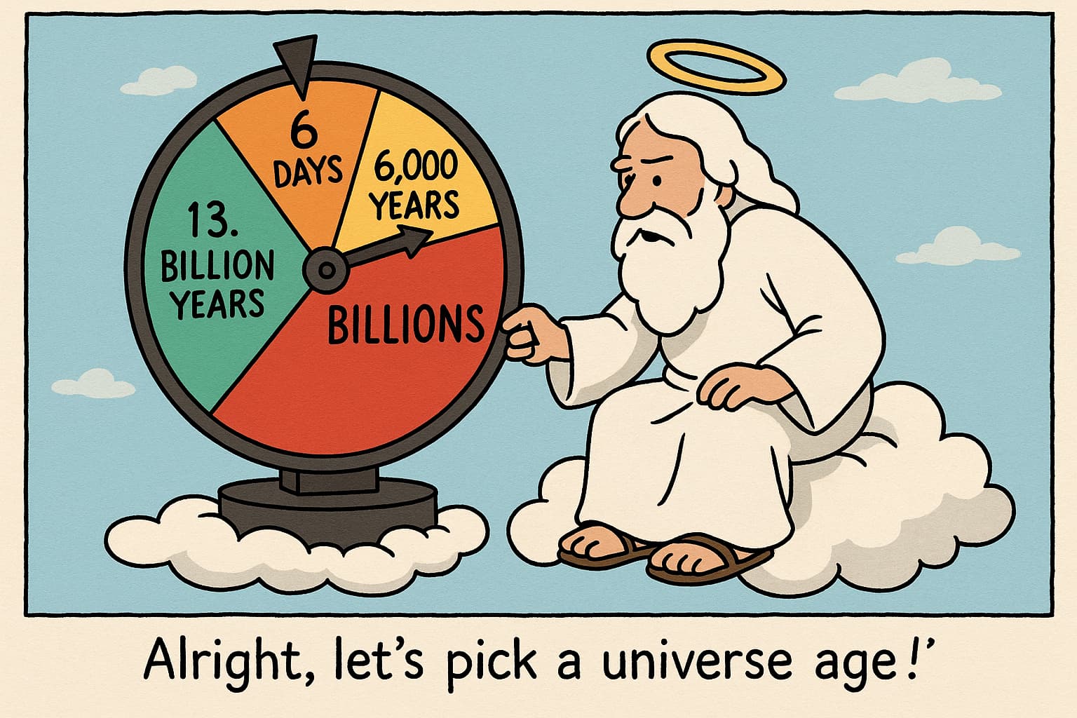 Funny, but the age of the universe is bound up with the laws of physics – a young universe would have to have different laws, else God is being deceptive.